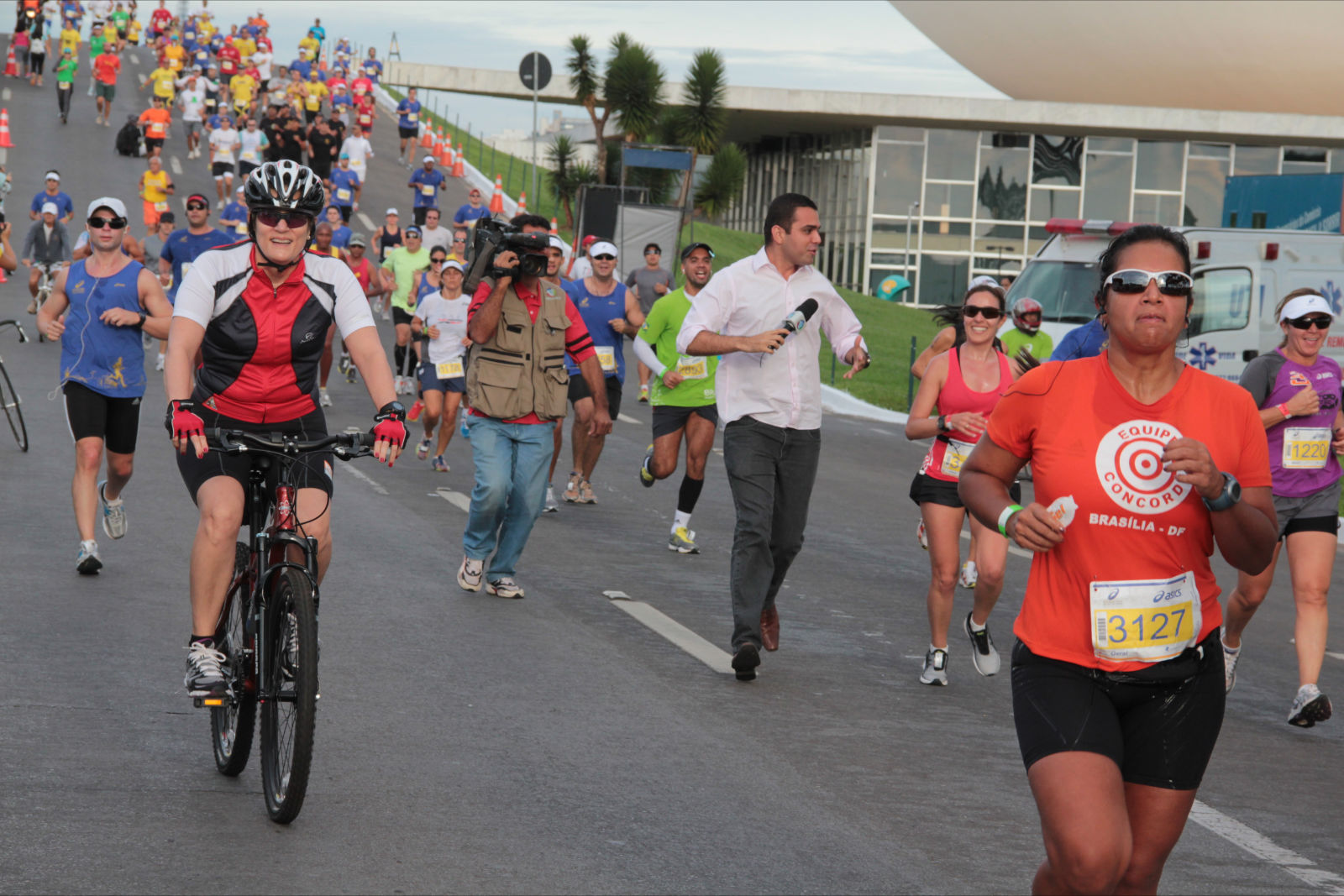 Curiosamente, logo após a rampa de descida do Congresso Nacional, minha esposa conseguiu flagrar um repórter tentando fazer uma entrevista com uma corredora durante a corrida. Não sei se ele conseguiu, mas, entrevista assim, somente consegui ver no “papo de esteira”.